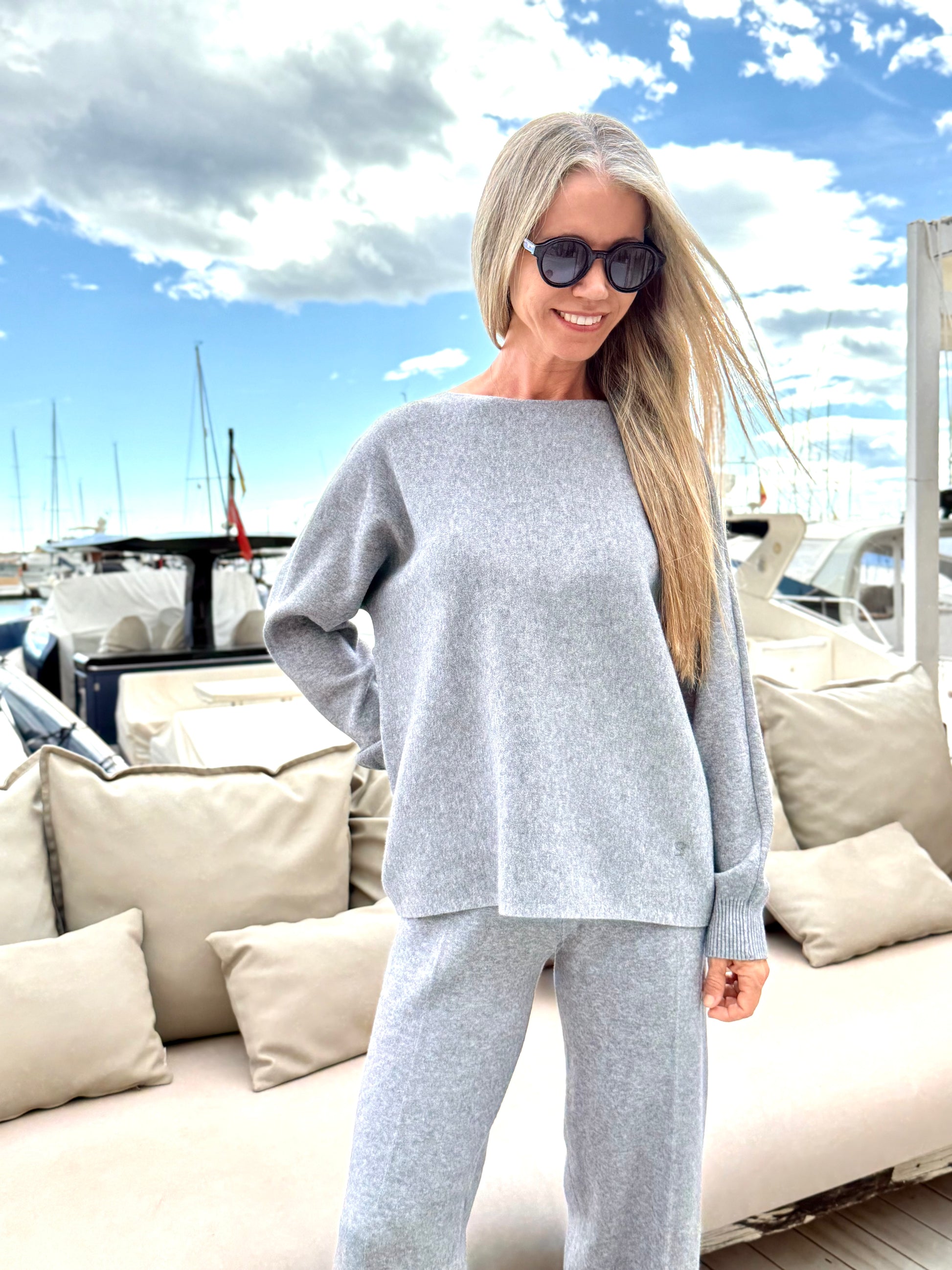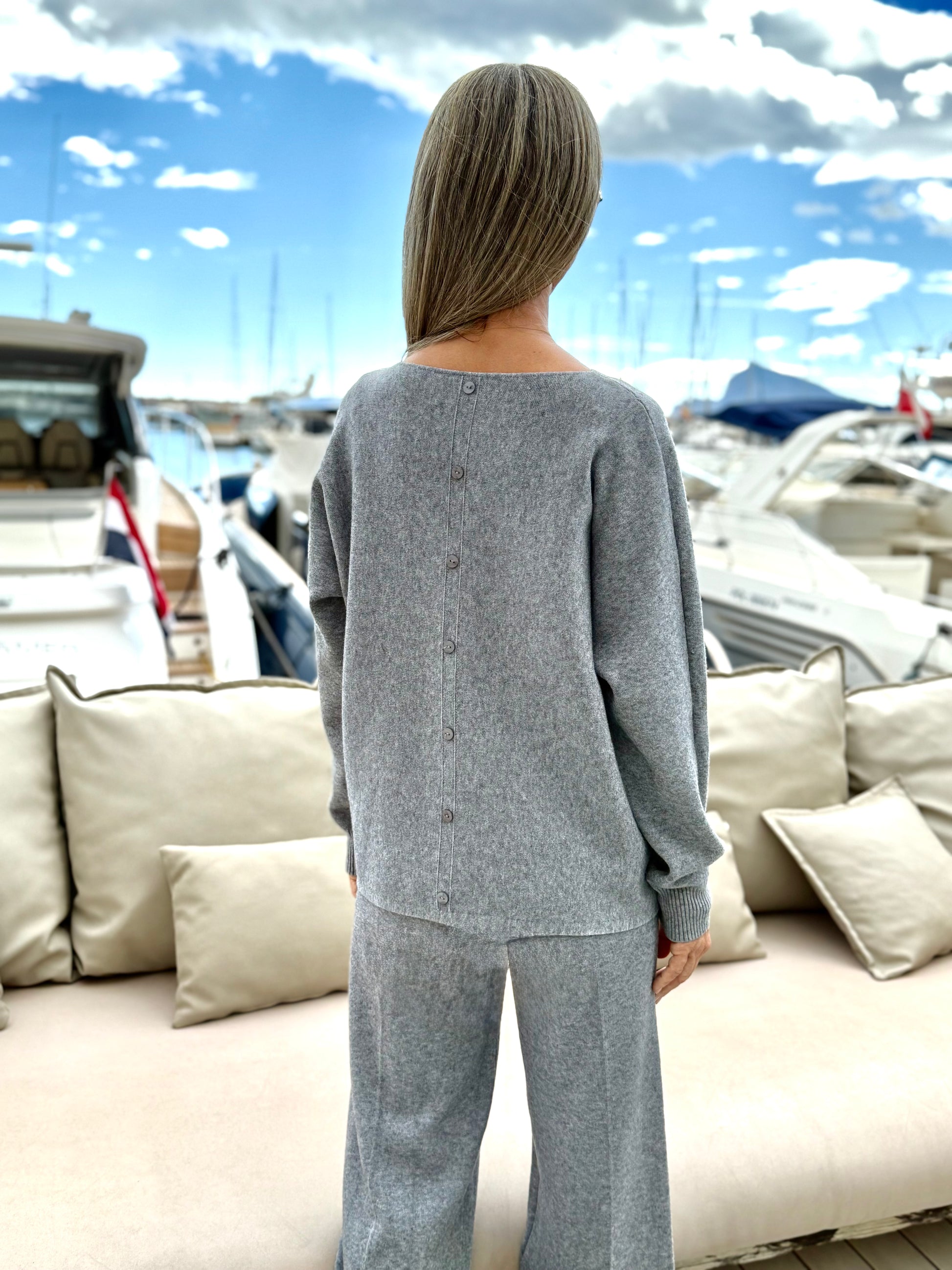 Soft wool-touch knit with a relaxed silhouette and back button detail.