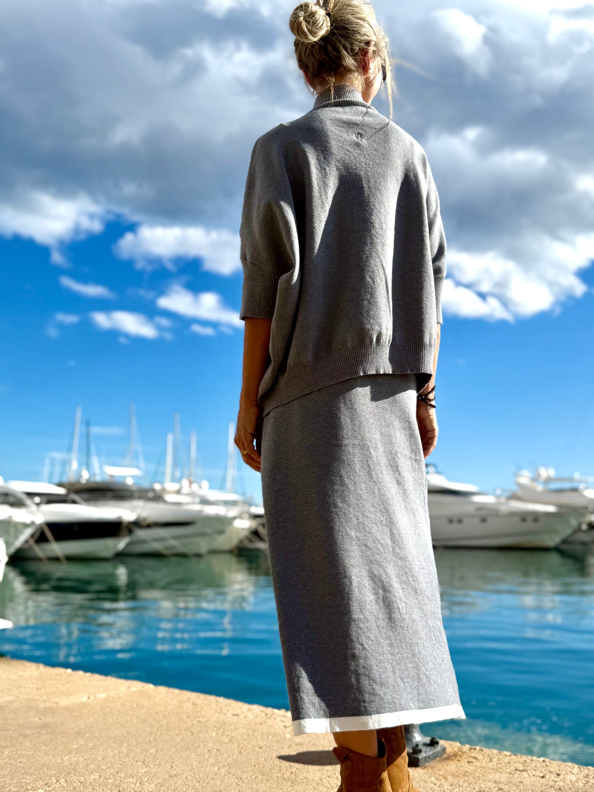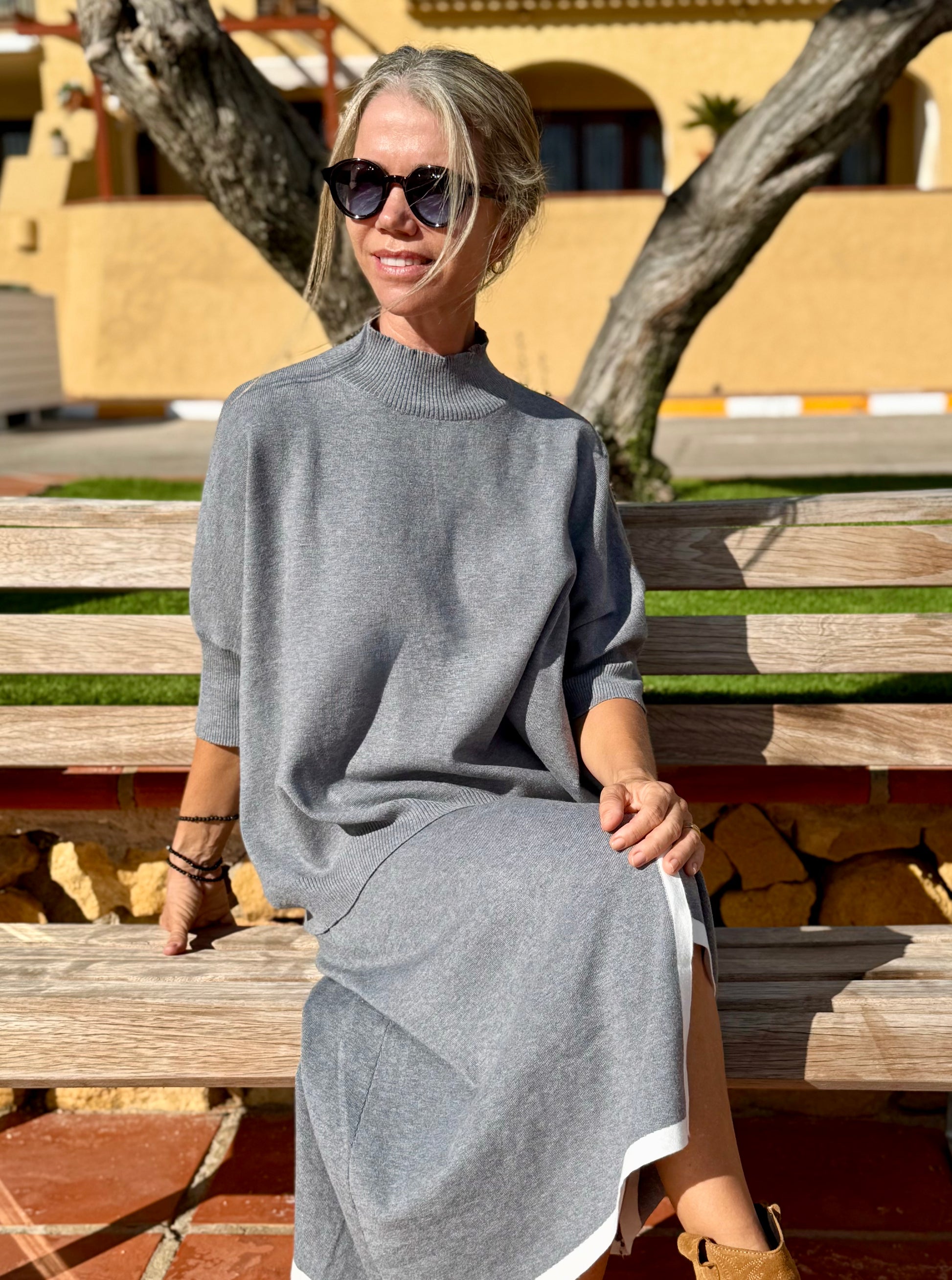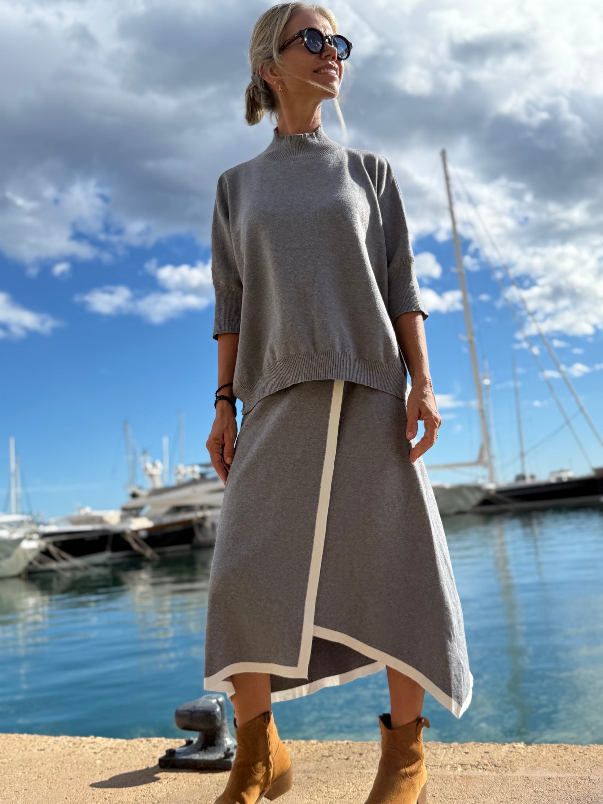 The soft grey knit skirt falls below the knee with an asymmetric wrap detail. A simple, versatile set designed for comfort and ease. It has a white trim, relaxed fit, mock neck, and mid-length sleeves.