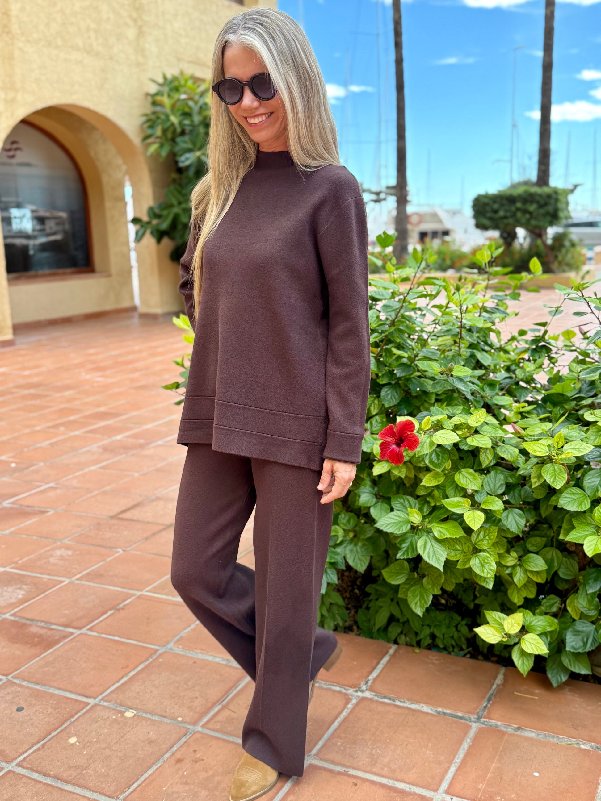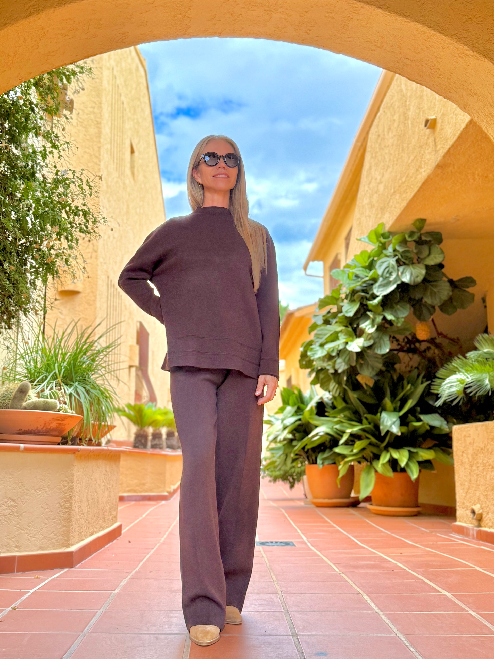 A relaxed knit set featuring wide-leg pants and an easy, oversized sweater.